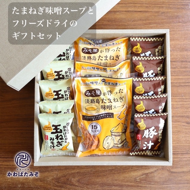 淡路島の玉ねぎを使った味噌スープとたまねぎ味噌汁と豚汁の2種のフリーズドライ詰め合わせたスープギフトセット。母の日、父の日、敬老の日、お中元、お歳暮、内祝いなどのギフトに たまねぎ味噌汁×5 豚汁×5 味噌スープ6g×45 熨斗が必要な場合はメッセージ問い合わせ、又は shop@kawabatamiso にメールお願いします。